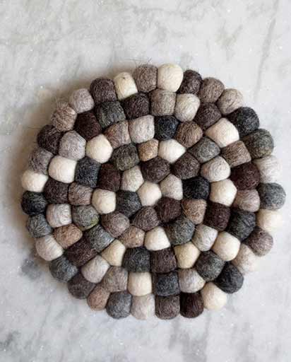 Natural Wool Felted Hot Pot Stand. This is a 100% wool felted Hot Pot Stand. This Natural Felt Ball Hot Pot stand is entirely handmade in Kathmandu, Nepal. This would make a perfect gift to a friend or loved one.